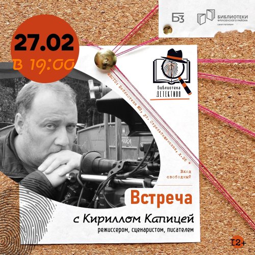 27 февраля 2026 года в библиотеке Фрунзенского района по адресу: г. Санкт-Петербург, ул. Стрельбищенская, д. 26 состоится встреча с режиссёром, сценаристом и писателем Кириллом Капицей. Он расскажет о своей новой книге «Ворон и Лис», недавно вышедшей в издательстве «Крылов», о героях, о сюжетах, о своих новых планах и ответит на вопросы гостей.